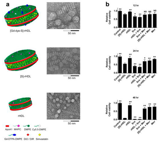 Schematic representations of nanoparticle formulations and in vitro efficacy data. (a) Schematic representation of dual gadolinium and fluorescent dye (Cy5.5, DiO, DiR) labeled statin containing reconstituted high density lipoprotein ([Gd-dye-S]-rHDL), statin containing rHDL ([S]-rHDL), and rHDL. (b) In vitro cell viability assays of murine macrophages (J774A.1), incubated with combinations of [S]-rHDL (10 μM statin) free simvastatin (10 μM), rHDL plus free statin (10 μM), free statin (10 μM) plus mevalonate (100 μM), [S]-rHDL (10 μM) plus mevalonate (100 μM), and only mevalonate (100 μM). There was also a control group of cells not incubated with anything. Macrophage cell viability was markedly decreased in the [S]-rHDL and free statin group. This effect was abolished by the addition of mevalonate, indicating that the effect of HMGR inhibition on cell viability is mediated through the mevalonate pathway. N = 6 for all bars. * p < 0.05, ** p < 0.01. Reprinted from Nature communications. Duivenvoorden, R., et al., A statin-loaded reconstituted high-density lipoprotein nanoparticle inhibits atherosclerotic plaque inflammation, pages 3065. Copyright 2014 [69].
