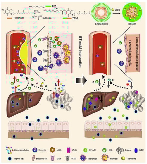 To date, most organic NPs carriers are used to deliver antioxidants (such as andrographolide, berberine and statins) [61,62,68]. Statins are widely orally administered cholesterol-lowering drugs that indirectly upregulate LDL receptor expression in liver cells. Due to the biotransformation in the liver, it is difficult for normal doses of statins to enter the systemic circulation, and increasing the dose of the drug is not feasible. Excessive amounts of drugs can cause damage to non-target organs. To solve this problem, Duivenvoorden et al. produced statin-loaded NPs constituted of high density lipoprotein cholesterol ([S]-rHDL), which can be intravenously injected, increase bioavailability, and improve efficiency in drug delivery to the plaque (Figure 1) [69]. The key finding of their study was that they were able to suppress the ROS production of macrophages through inhibiting the intracellular mevalonate pathway. [S]-rHDL accumulating in the plaque and being absorbed by macrophages significantly reduced inflammatory response and plaque volume. Finally, they confirmed that a 3-month low-dose [S]-rHDL treatment regimen could inhibit the progression of plaque inflammation, while a 1-week high-dose treatment regimen could significantly reduce the inflammatory progression of advanced atherosclerotic plaques. [S]-rHDL is a new, powerful AS nanotherapy that directly affects plaque inflammation. In addition, Ma et al. synthesized a functional nano-vector (BT1500M), which was formed by the esterification of VE succinate with PEG to encapsulate berberine (BBR, Figure 2) [68]. Their data showed that BT1500M increased BBR deposition in the liver and adipose by 107.6% and 172.3%, respectively. In in vitro and in vivo, the investigation found that BT1500M changed AMPK and NF-κB gene expression, successfully inhibited the triggering of macrophage activation and interrupted the cross-talk process between adipocytes and macrophages, which may contribute to its anti-inflammatory effect. Another study demonstrated that BT1500M reduced endothelial lesions, macrophage activation, cytokine release, and cholesterol ester accumulation in the aortic arch, thereby improving arterial plaque formation. This study provided a practical strategy for treating AS using a BBR-entrapped nanosystem.