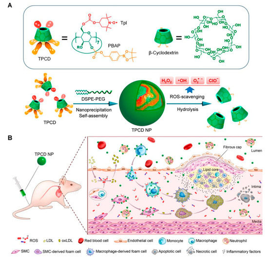 Schematic of engineering a broad-spectrum ROS-scavenging nanoparticle and targeted therapy of AS. (A) Chemical structure of a broad-spectrum ROS-eliminating material TPCD and development of a TPCD nanoparticle (TPCD NP). (B) Sketch of targeted treatment of AS by eliminating ROS through i.v. administration of engineered TPCD NP. Reprinted with permission from ACS nano. Wang, Y., et al., Targeted Therapy of Atherosclerosis by a Broad-Spectrum Reactive Oxygen Species, pages 8943–8960. Copyright 2018 American Chemical Society [55].