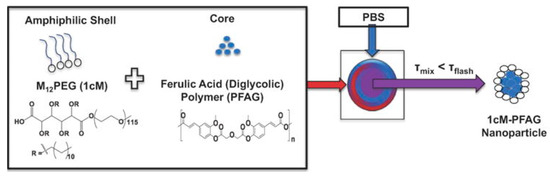 Description of the flash nanoprecipitation process for the formulation of the nanoparticles. Reprinted with permission from Acta biomaterialia. Chmielowski, R.A., et al., Athero-Inflammatory Nanotherapeutics: Ferulic Acid-based Poly(anhydride-ester) Nanoparticles Attenuate Foam Cell Formation by Regulating Macrophage Lipogenesis and Reactive Oxygen Species Generation, pages 85–94. Copyright 2018 [49].