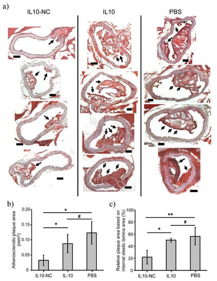 (a) Oil red O (ORO) staining of plaques in aortic root cross-sections after i.v. injection of IL-10-NC, IL-10, and PBS. Samples were injected once a week for 3 weeks. Black arrows indicate plaques. Quantitative analysis of relative atherosclerotic plaque area (b) from the ORO-stained (a) images, and (c) based on internal elastic lamina area and atherosclerotic plaque area (n = 4, * p < 0.05, ** p < 0.01, and # not significant). Reprinted from Biomaterials. Kim, M., et al., Targeted delivery of anti-inflammatory cytokine by nanocarrier reduces atherosclerosis in ApoE−/− mice, pages 119550. Copyright 2020, with permission from Elsevier [60].