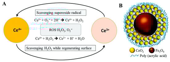 Regenerative antioxidant properties of cerium oxide and the simulation structure of iron oxide/cerium oxide core-shell nanoparticles. (A) Regenerative antioxidant properties of cerium oxide show that cerium ions are capable of scavenging superoxide radicals when trivalent cerium ions change to tetravalent cerium ions. On the other hand, cerium oxide has the ability to scavenge H2O2 when tetravalent cerium ions become trivalent cerium ions. (B) Simulation structure of iron oxide/cerium oxide core-shell nanoparticles. Reprinted with permission from Journal of Materials Chemistry B. Wu, Y., et al., Novel iron oxide-cerium oxide core-shell nanoparticles as a potential theranostic material for ROS related inflammatory diseases, pages 4937–4951. Copyright 2018 Royal Society of Chemistry [77].