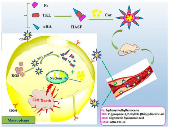 Cur release mechanism diagram of dual ROS-sensitive and CD44 receptor targeting nanoparticles. Reprinted with permission from Carbohydrate polymers Hou, X., et al., Novel dual ROS-sensitive and CD44 receptor targeting nanomicelles based on oligomeric hyaluronic acid for the efficient therapy of atherosclerosis, pages 115787. Copyright 2020, with permission from Elsevier [52].
