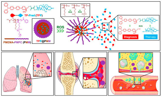 With the growing demand for drug delivery to higher standards, ROS-responsive NPs have increasingly attracted the interest of researchers [67,83]. ROS-responsive NPs are developed to release drugs only at the target sites which generate excess ROS. Through this, these NPs could contribute to both improving treatment efficiency and reducing adverse side effects [53,54,67,83,84,85,86,87,88]. In consideration of the excess ROS level in an abnormal organization, many ROS-sensitive materials, including polythioether ketal, ketone mercaptan, ferrocene and selenium-containing copolymers, have been explored [52,57]. Hou et al. synthesized a new ROS-sensitive and CD44 receptor targeting amphiphilic carrier material, oligomeric hyaluronic acid-2′-[propane-2,2-diyllbls (thio)] diacetic acl-hydroxymethylferrocene (oHA-TKL-Fc), named HASF (Figure 7) [52]. Then, they combined curcumin (Cur) with HASF into nano-micelles (HASF@Cur micelles) by the self-assembling method. At an excessive ROS level, the thioketone bond of HASF could break. A release study in vitro showed that the efficiency of Cur release from HASF micelles was related to the concentration of ROS. Moreover, an in vivo study showed that the lesion area was reduced to 47.3 ± 3.4% when treated with HASF@Cur micelles, compared with the Cur group (63.2 ± 2.7%). HASF@Cur micelles had the more remarkable effect in reducing the lesion area. Dou et al. synthesized ROS-responsive NPs by chemical modification based on β-cyclodextrin [85]. β-cyclodextrin is a novel, ROS-sensitive material. In this strategy, they demonstrated that Rapamycin was released in an ROS-responsive manner. Furthermore, their study found that ROS-responsive NPs, which trigger almost no inflammatory response in in vitro or in vivo, effectively inhibited macrophage proliferation and foam cell formation through endocytosis and intracellular release of cargo molecules from macrophages. In addition, the sites overexpressing ROS can be used as targets for directed delivery of therapeutic agents and accurate fluorescence diagnosis. Furthermore, Ma et al. constructed therapeutic NPs (TPP) with continuous ROS responsiveness and two-photon AIE bioimaging for multimodal diagnosis and precise treatment of the lesions of excess ROS [53,84]. Prednisolone was connected to the two-photon fluorophore through ROS-sensitive bonds to form the diagnostic and therapeutic compound TPP, then loaded by the amphiphilic polymer self-assembled into a core–shell structured micelle (Figure 8) [53]. After the micellar interruption was triggered by excessive ROS, the TPP was able to react to the inflammatory environment and further release the drugs inside. As a result, the NPs showed a favorable ability of efficient AS treatment via effective anti-inflammatory activity and high resolution diagnosis of inflammation.