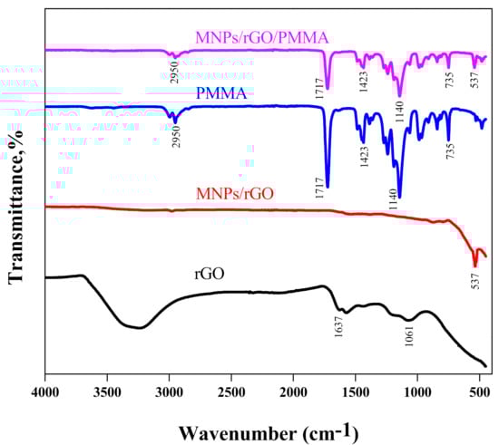 The synthesized composite (MNPs/rGO/PMMA) was confirmed via FTIR analysis, XRD analysis and SEM analysis. Figure 1 shows the FTIR spectra of rGO, MNPs/rGO, PMMA and MNPs/rGO/PMMA. The FTIR spectrum of rGO shows characteristic peaks of the C=C stretching bond of alkene and C–O stretching of the hydroxyl group at “1637 cm−1” and “1061 cm−1”, respectively. The rGO (rGO) impregnated with magnetic Fe3O4 showed an additional peak at “537 cm−1”, which gives a clear identification of the Fe–O–Fe bond [37]. The FTIR spectrum of PMMA displays the characteristics peaks of C–H bending of the α– methyl group, C–O stretching of aliphatic ether, C–H bending of a methylene group, C=O stretching of the carboxylic functional group and C–H stretching of the methyl group at 735 cm−1, 1140 cm−1, 1423 cm−1, 1717 cm−1 and 2950 cm−1, respectively. The spectrum of the composite sample reflects the extra peak of Fe–O–Fe stretching at 537 cm−1 due to the magnetic rGO (MNPs/rGO) incorporated to PMMA, which indicates that the polymer was successfully magnetized [38].