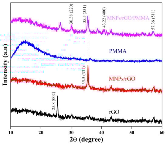 The XRD configuration of rGO indicates a solid peak at 2θ of 25.8, which confirms the reduction of GO as shown in Figure 2 [39]. In the case of magnetized rGO, a peak at 2θ of 35.5 displayed that it matched with a face-centered cubic crystal of JCPD file card number 19-0629, suggesting the confirmation of impregnation of magnetic Fe3O4 on the rGO [37]. The XRD arrangement of pure PMMA gives no peak due to its amorphous nature. The XRD design of the composite (MNPs/rGO/PMMA), exhibits peaks corresponding to Fe3O4 at 2θ of 30.38° (220), 35.5° (331), 43.22° (400) and 57.36° (511), respectively, which confirms the MNPs/rGO/PMMA composite [40,41]. From the XRD data, the crystallite size of the composite was estimated to be 31 nm.
