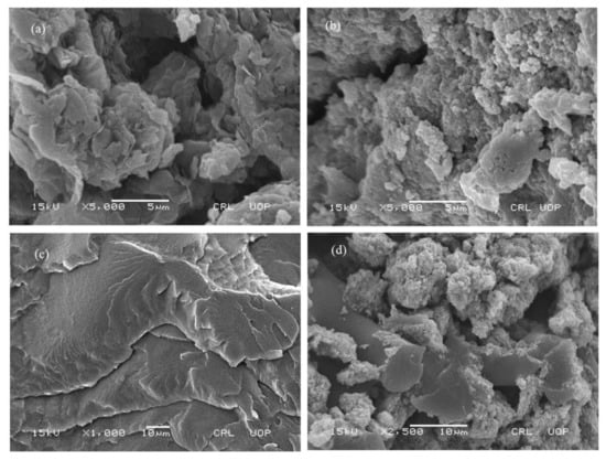 The SEM micrographs of rGO, MNPs/rGO, PMMA and MNPs/rGO/PMMA are given in Figure 3a–d. The micrograph of rGO indicates a fluffy and chipped morphology, which may be a stacked structure of graphene sheets linked by Van der Waal’s forces, as shown in Figure 3a. Fe3O4-NPs were consistently scattered over the rGO sheets, as shown in Figure 3b [42]. The PMMA matrix is in the form of smooth uniform layers with no pores, in the form of sheets spread over each other, as can be seen in Figure 3c [43]. The micrograph of MNPs/rGO/PMMA confirms the magnetic MNPs dispersed on the surface of the PMMA/rGO sheets. MNPs/rGO/PMMA seems a uniform layer, indicating all components were properly incorporated together (see Figure 3d) [44]. From the SEM micrographs, the average size of the rGO flakes is found to be about 2000 nm, whereas that of MNPS is about 100 nm.