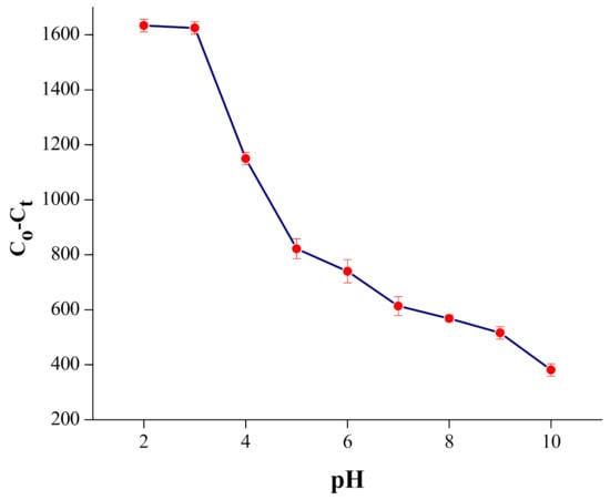 The pH of the reaction medium has an exceptional impact on the charge density on the adsorbent surface and the assurance of the change of Cr species [45]. The Cr(VI) adsorption on the composite was carried at various pH ranges, from 2 to 10, while the other parameters were kept constant. The pH of the investigated solution was adjusted using 0.1 N NaOH or HCl solution, according to necessity. It was noticed that the most extreme adsorption was found at pH 2.0 (100 ± 1), as shown in Figure 4.