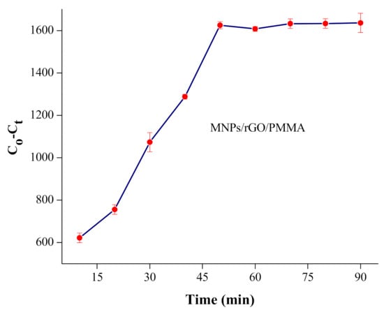 To achieve maximum adsorption over adsorbent (MNPs/rGO/PMMA) versus time, various contact periods of time, running from 10 min to 1 h, were determined. The outcomes show that the % adsorption of Cr(VI) was enhanced versus time; finally, stability was reached after 30 min, as shown in Figure 6.