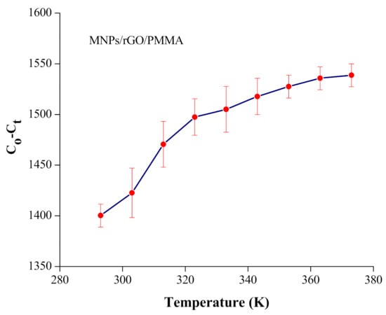 The batch mode adsorption of Cr(VI) onto the MNPs/rGO/PMMA was investigated in triplicate and the average values of the standard deviations were recorded. The percent adsorption of Cr was determined using Equation (1)
