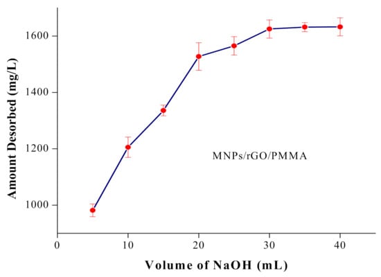 The percent adsorption of Cr(VI) is dependent on the amount of adsorbent dose in wastewater. To explore the impact of adsorbent (MNPs/rGO/PMMA) dose, batch adsorption experiments were conducted using dosages ranging from 20 mg to 250 mg. Results indicate that the % Cr(VI) adsorption was enhanced, as the amount of adsorbent dose was increased, and the maximum percent adsorption was found at 150 mg (99.53 ± 1), as shown in Figure 5. The significant rise in Cr(VI) adsorption with the increase in the amount of composite material was due to the availability of a larger surface region of the adsorbent and a large number of active sites [51]. A further enhancement of the amount of composite material to 240 mg showed no considerable variation in percent adsorption of Cr(VI). Hence, 150 mg was chosen as an ideal amount of (MNPs/rGO/PMMA) adsorbent to the be studied.