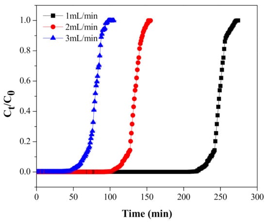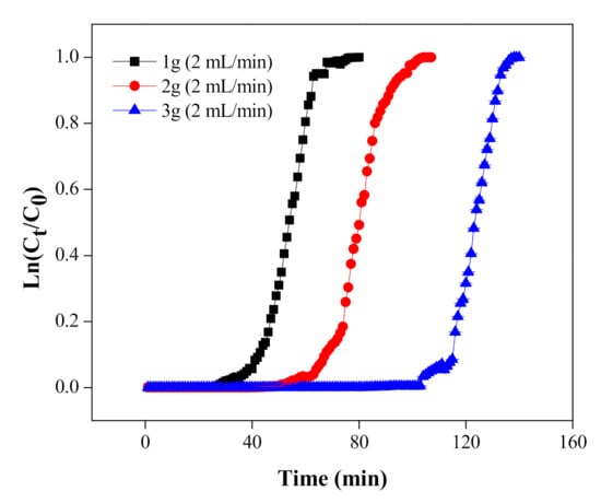 The continuous fixed-bed column process was stopped when the effluent concentration was equal to the initial concentration. The breakthrough cure was calculated from different adsorbent masses and flow rates by plotting graphs between Ct/C0 and time. In most of the continuous fixed-bed system, the breakthrough curves are S-shaped with variable degrees of sharpness and location of the breakthrough point.