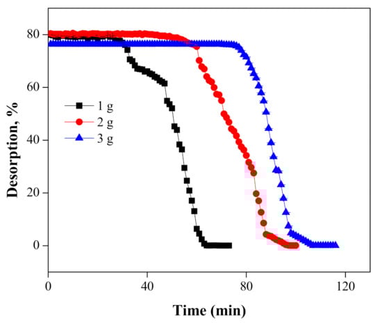 where “C0” (mg/g) and “Ct” (mg/g) are the initial and final concentration in the outlet, “KYN” (min−1) is the rate constant of Yoon–Nelson and “τ” (min) is the flow time required for the 50 percent breakthrough curve. The values of “qe” and “KTH” were obtained from the linear plot between ln C 0 C t 1 and time (t), as shown in Figure S7 (Supplementary Materials).