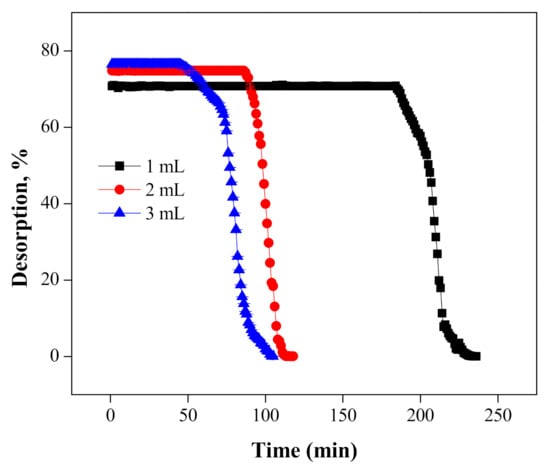 To regenerate the adsorbent and recover the Cr(VI) ion, an eluent reagent was used. The Cr(VI) ions which were loaded on different masses of adsorbent with a uniform flow rate 2 mL/min were desorbed using a 2 M NaOH solution. Similarly, the Cr(VI) analytes which were loaded on 3 g of composite with different flow rates (1, 2 and 3 m/L/min) were also desorbed through the 2M NaOH solution.