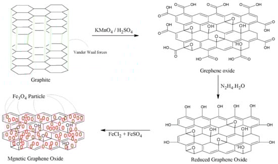 An in situ method was used to prepare MNPs/rGO, in which 1 g of rGO was dispersed in 100 mL of distilled water and sonicated using ultrasonication for 2 h. The FeCl3 and FeSO4 solutions were added to the suspension in a ratio of 2:1 and agitated for 2 h at 80 °C under nitrogen atmosphere. A volume of 10 mL of 35% NH4OH solution was added dropwise for 2 h to blend. A dark-black precipitate of MNPs/rGO was obtained; the sequences of changes are indicated by the following reactions: