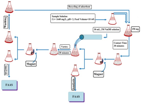 In the desorption experiments, the composite sample was shacked with 2 M sodium hydroxide (NaOH) for 30 min to desorb Cr(VI) ions from the surface. The composite was collected from the medium by an external magnetic field. The eluent was also analyzed via FAAS to determine the Cr(VI) concentration. The scheme of the experiment is shown below (Scheme 2).