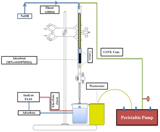 For fixed-bed column adsorption studies, a glass column of 50 cm in height and 2 cm in internal diameter was used, into which a swab of glass wool was inserted. A total of 1 g of MNPs/rGO/PMMA adsorbent was loaded into the column and another glass wool swab was placed on the top of the adsorbent bed to avoid disturbance of the adsorbent surface during the flow of the sample. The diagrammatic illustration of the fixed-bed column is shown in Scheme 3. Initially, the composite packed column was rinsed with distilled water and left for a night to clarify the thorough distribution of adsorbent particles. Wastewater containing 1640 mg/g was impelled, downstream mode, into the column with the assistance of a peristaltic pump. Primarily, the collected adsorbate was discarded for one minute to ensure an unbroken stream rate. Afterward, the discharge samples were collected successively for further analysis at consistent interval of time, flow rate and adsorbent masses. This was performed from the bottom of the column to investigate the breakthrough point.