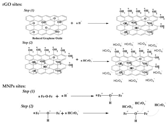 The adsorption of Cr(VI) over the MNPs/rGO/PMMA was carried out in batch mode under different conditions, including pH, adsorption time, adsorbent dose, temperatures, etc.
