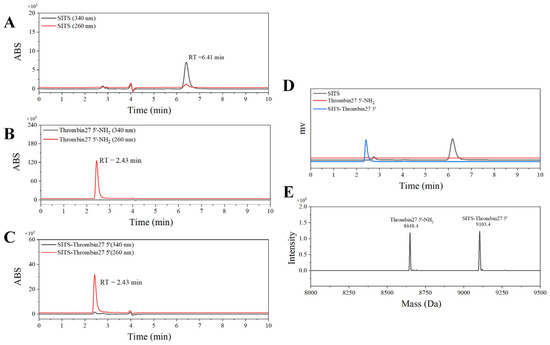 A HPLC 20A system (Shimadzu Corporation, Kyoto, Japan) paired with a 4.6 mm× 250 mm × 5 µm ZORBAX Eclipse Plus 95 Å C18 HPLC column (Agilent Technologies, Inc., Santa Clara, CA, USA) was used for the chromatographic characterization of SITS-thrombin aptamers (SITS-TAs). The sample injection volume was 10 μL, and the isocratic elution was carried out at a flow rate of 0.75 mL·min−1 with solvent A (ammonium acetate, 25 mM, pH = 6.8) and solvent B (acetonitrile) in a 1:4 (v/v) ratio. The full-wavelength scanning data were recorded, and the wavelengths for identification and quantification of thrombin aptamers and SITS were selected to be 260 nM and 340 nM, respectively. Ultraviolet/visible (UV/Vis) absorption spectra of products in the range of 200–500 nM were recorded by a UV spectrophotometer (UV-2700, Shimadzu Corporation, Kyoto, Japan). Quantum yield measurement was conducted in Hangzhou Yanqu Information Technology Co., Ltd. (Hangzhou, China), using a C9920-02G quantum yield spectrometer (Hamamatsu Photonics K.K., Hamamatsu City, Japan). In order to further investigate the formation of conjugate structure, relative molecular mass was analyzed by LC/TOF-MS (Thermo Fisher Scientific, LCQ DECA XP PLUS) (Sangon Biotech Co., Ltd., Shanghai, China). In the LC/MS test setting, chromatographic separation was carried out on an XBridge Oligonucleotide BEH C18 Column (Waters corporation, Milford, MA, USA), 130 Å, 2.5 μM, 4.6 mm × 50 mm. The gradient elution was performed with a 0.3 mL/min flow rate using solvent C (water with 0.075% 1,1,1,3,3,3-hexafluoroisopropyl acrylate (HFIPA), 0.035% N,N-diisopropylethylamine (DIEA), and 1% 10 μM EDTA) and solvent D (80/19 v/v ratio of acetonitrile and water with 0.075% HFIPA, 0.035% DIEA, and 10 μM EDTA) with a linear gradient program from 5% to 35% D in 15 min at 40 °C. The MS detection was performed in negative mode with 4.0 kV applied to the capillary voltage, atomizing gas pressure of 0.28 MPa, humidity of 350 °C, fragmentation voltage of 150 V, and nitrogen as an atomizing gas.