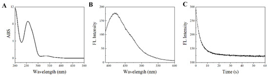 UV/Vis absorption spectrum (A), fluorescence emission spectrum (B), and fluorescence attenuation curve (C) of SITS-Thrombin27 5′. Absorption λmax: 260 nm and 333 nm; emission λmax: 426 nm for SITS-Thrombin27 5′.