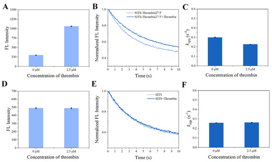 Evaluation on nonspecific stilbene interactions. Fluorescence intensity of SITS-Thrombin27 5′ (A) and SITS (D) in the presence of thrombin. Fluorescence attenuation curves of SITS-Thrombin27 5′ (B) and SITS (E) (λex = 333 nm, λem = 426 nm) and corresponding kapp values of SITS-Thrombin27 5′ (C) and SITS (F) upon the addition of thrombin.