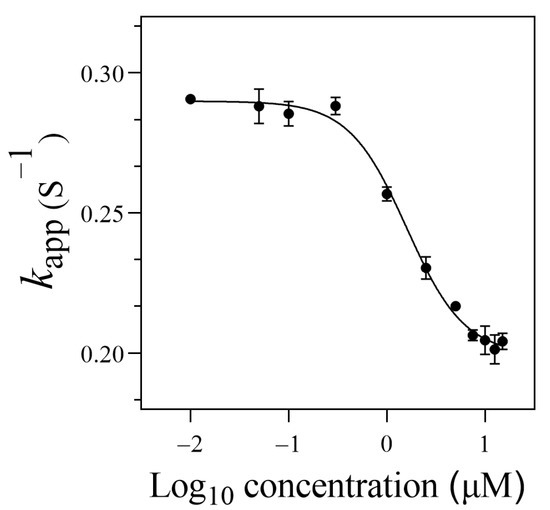 In the presence of thrombin, the SITS-Thrombin27 5′ displayed a response to the target, evidenced by the significant change in fluorescence attenuation and the kapp (Figure 4B,C), indicating that enzyme–aptamer binding could be characterized by the prepared sensor. We further tested nonconjugated SITS under the same conditions, while no obvious change in fluorescence attenuation and the kapp was observed (Figure 4E,F). In addition, mixture of nonconjugated SITS and thrombin did not result in fluorescence enhancement (Figure 4A,B). These results suggest that the thrombin-induced variation in the fluorescence attenuation of SITS may only be affected when grafted on the thrombin aptamer. The fluorescence enhancement property seems to allow the determination of the binding equilibrium dissociation constant (Kd) [38,39,40]. However, this approach may suffer a potential alteration of fluorescence intensity caused by isomerization. Herein, by recording the kapp values in the presence of different concentrations of thrombin, a converged response curve was obtained, and the Kd value was calculated to be 1.59 μM (Figure 5).