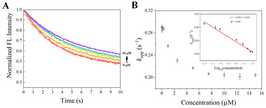 (A) Fluorescence attenuation curves of SITS-Thrombin27 5′ in the presence of various thrombin concentrations. (B) The calculated kapp value as a function of thrombin concentration; insert shows that the change in kapp is linear with logarithm of thrombin concentration over the range from 0.3 to 10 μM.