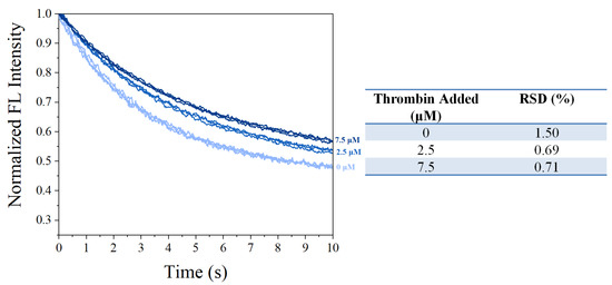 After the properties required for sensing were confirmed, the synthesized SITS-Trombin27 5′ was studied for its sensing performance on thrombin. Figure 6A,B display the fluorescence attenuation curves and kapp of SITS-Thrombin27 5′ in the presence of different concentrations of thrombin. With increasing concentration of thrombin, a trend of fluorescence attenuation inhibition was observed, resulting in a gradual decrease in attenuation kinetics. As shown in Figure 6B, a relative narrow linear range of kapp against thrombin concentration was obtained from 0.01 μM to 2.5 μM (y = −0.0277x + 0.291, R2 = 0.953). Moreover, the kapp was linearly correlated with the logarithm of thrombin concentration in the range from 0.3 μM to 10 μM, and a calibration equation of y = −0.0568x + 0.257 (R2 = 0.981) was obtained. The LOD for the aptasensor was then calculated to be 0.205 μM, defined as the 3σ criterion. In addition, in order to investigate the repeatability, fluorescence attenuation of the sensor was tested with thrombin at 0 μM, 2.5 μM, and 7.5 μM concentrations with three replicates. A relative standard deviation (RSD %) of no more than 1.5 was obtained for all the tests, demonstrating good reproducibility (Figure 7).