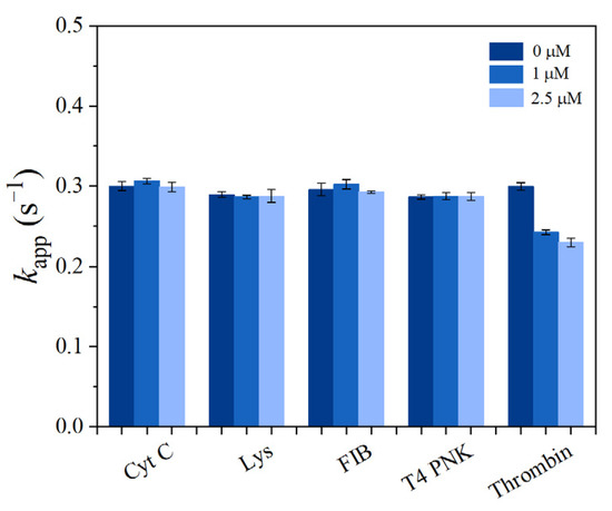 To investigate the selectivity of the prepared sensor SITS-Thrombin27 5′, similar tests were conducted on Cyt C, FIB, Lys, and T4 PNK (as interfering proteins) in PBS, and the responses to these proteins were recorded and compared. According to the literature [41], the concentrations investigated were 1 μM and 2.5 μM for the proteins, with the exception of 35 U·mL−1 and 89 U·mL−1 for T4 PNK. In the tested condition, the control proteins did not significantly alter the kapp of SITS-Thrombin27 5′, whereas thrombin significantly change the kapp under the same conditions (Figure 8). Moreover, the kapp values resulting from thrombin were obvious lower than those of the control proteins tested. This result demonstrates good specificity of the aptasensor for the sensing of thrombin.