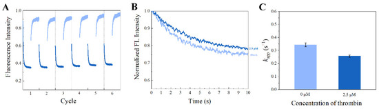 Regenerating of the SITS-Thrombin27 5′ aptasensor. (A) SITS-Thrombin27 5′ excited at ex/em = 333 nm/426 nm (trans–cis) for 60 s followed by ex/em = 280 nm/426 mm (cis–trans) for 60 s for six cycles as an illustration. (B) The fluorescence attenuation curves and (C) the kapp values of the SITS-thrombin27 5′ after six illustration cycles in the presence and absence of thrombin.