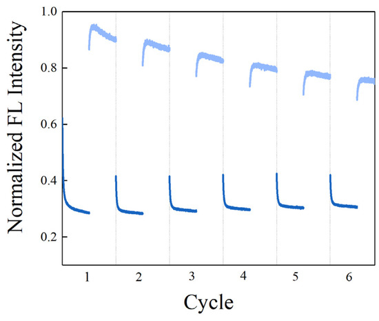 Regeneration of the SITS-Thrombin27 5′ aptasensor in the presence of thrombin. The sample was excited at ex/em = 333 nm/426 nm (trans to cis) for 60 s followed by ex/em = 280 nm/426 mm (cis to trans) for 60 s for 6 cycles as illustration.