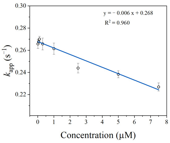 To verify the feasibility of the aptasensor in biological sample detection, we applied the developed method to detect thrombin spiked with 1% mouse serum. Determination of LOD in spiked biological samples is a common way to verify the performance of biosensors [13,42,43]. As displayed in Figure 11, the kapp of SITS-Thrombin27 5′ showed a relatively good linear response against thrombin in the range of 0.3–7.5 μM, and the LOD was calculated to be 0.56 μM.