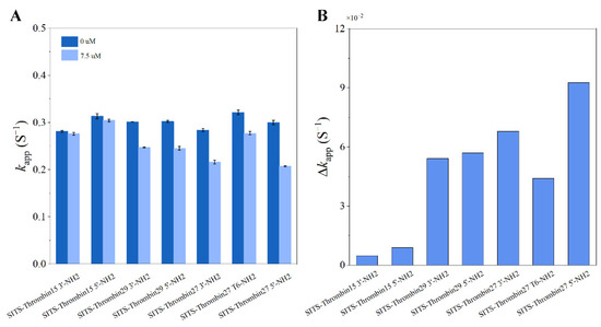 (A) The apparent fluorescence attenuation rate constant kapp of different SITS-TAs in the presence and absence of 7.5 μM thrombin. (B) The corresponding difference in kapp (Δkapp).