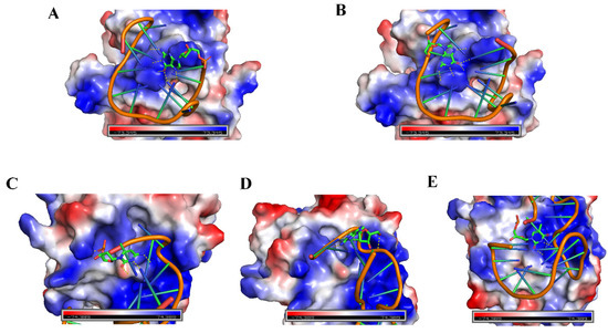 Preliminary insight into structural features on the interface of the aptamer–thrombin complexes. (A) Thrombin–Thrombin15 3′ site view. (B) Thrombin–Thrombin15 5′ site view. (C) Thrombin–Thrombin27 3′ site view. (D) Thrombin–Thrombin27 5′ site view. (E) Thrombin–Thrombin27 T6 site view. Images of structural features (PDB ID: 4I7Y and 4DII) were visualized using PyMOL software.