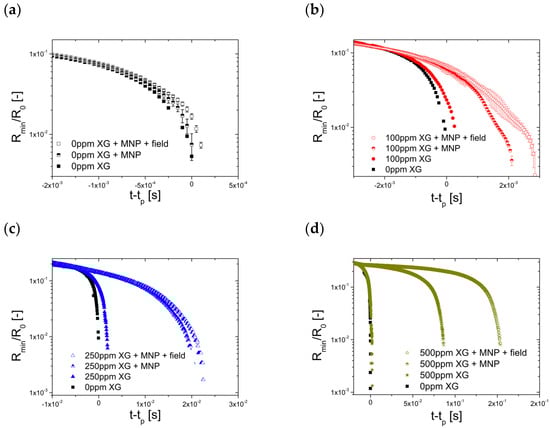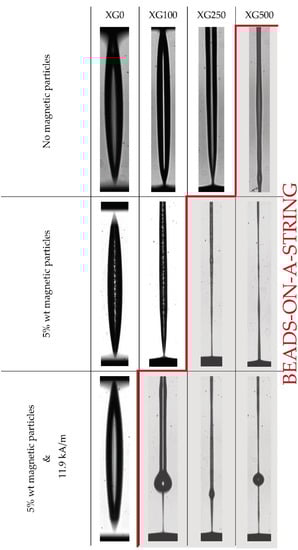 - Sadek, S.H.; Najafabadi, H.H.; Galindo-Rosales, F.J. Capillary breakup extensional magnetorheometry. J. Rheol. 2020, 64, 55–65. [Google Scholar] [CrossRef]