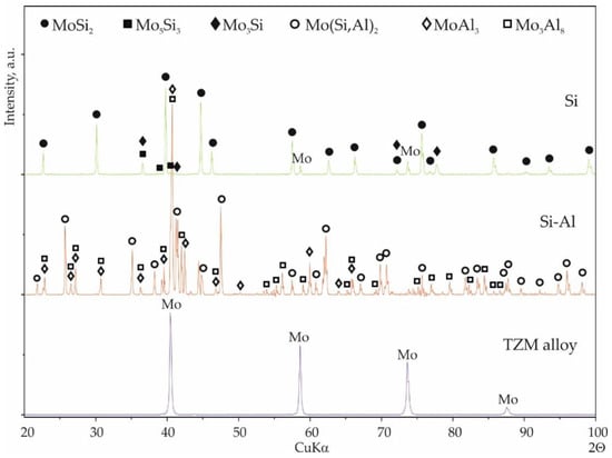 - Majumdar, S. Formation of MoSi2 and Al doped MoSi2 coatings on molybdenum base TZM (Mo-0.5Ti-0.1Zr-0.02C) alloy. Surf. Coat. Technol. 2012, 206, 3393–3398. [Google Scholar] [CrossRef]
