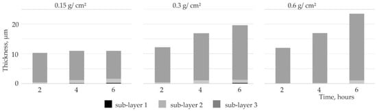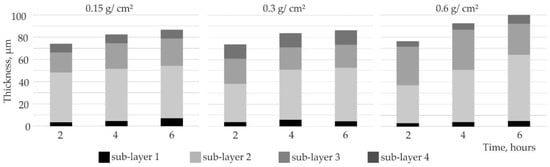 - the coating growth kinetics for 0.15 and 0.3 slurry volumes were similar. The thickness of the coatings produced for 2, 4, and 6 h was on average 75, 82, 85 µm, respectively,