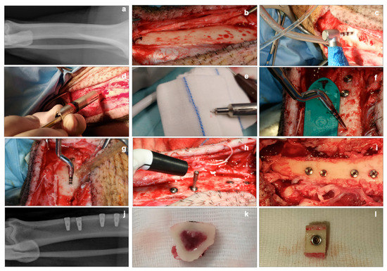 Clinical aspects. (a): conventional X-ray of the tibia before surgery. (b): exposure of the tibial bone after ungluing of the periosteum. (c): implant site preparation using a drill. (d,e): device used for intraoperative measurement of cortical thickness. (f,g): distance measurement for implant site preparation, using the mallet technique. (h): detection of the implant stability quotient (ISQ) with the Penguin RFA instrument at T0. (i): clinical view of the four implants inserted (two sites with the mallet technique, two sites with drill technique). (j): conventional X-ray of the tibia after implants placement. (k,l): bone slices for histological and biomolecular analyses.