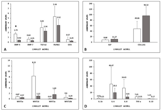 The canonical Wnt3a was less expressed in the case of mallet instrumentation, whereas all the other members examined (Wnt5a, Wnt10b, and Wnt16) were higher than in drill sites (Panel C). Moreover, regarding Wnt expression, the differences were not statistically significant.