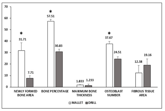 Figure 3 shows that in mallet sites, a significant increase of newly formed bone area, bone percentage, and osteoblast number was present. The greater amount of bone tissue was coupled with a smaller, nonsignificant amount of fibrous tissue. No significant increase in the maximum length of the newly formed bone was observed.