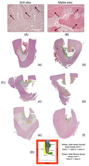 Histological images of peri-implant tissues and scheme of area calculation. (A) The fibrous tissue (white arrows) was greater than newly formed bone tissue (black arrows) in drill-prepared sites (Hematoxylin and Eosin, 400×). (B) In the mallet site, the amount of newly formed bone tissue (black arrows) is greater than that of fibrous tissue (white arrows) (Hematoxylin and Eosin, 400×). (C) Areas of new bone and fibrous tissue deposition, expressed as total surface (mm2), using an imaging computer software, according to the Han, J.-M. et al. [19] protocol. In every picture, in yellow, areas of new bone deposition and in green, areas of fibrous tissue. (a,c,e): tissues from sites prepared with drill technique, in the three different animals; (b,d,f): tissues from sites prepared with mallet technique in the three different animals. The bone samples obtained from mallet sites show a greater area of newly formed bone and a lower area of fibrous tissue compared to drill ones. (D) Example of scheme for calculating the newly formed bone and fibrous tissue around the implants.