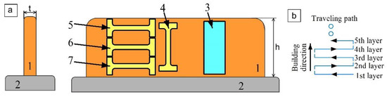 Sample preparation scheme (a) and EBAM layer deposition strategy (b) 1—Cu-7.5wt.%Al bronze wall; 2—stainless steel substrate; 3—microstructural characterization sample; 4—sample with tensile axis orientation along the wall height; 5–7—samples with tensile axis orientation perpendicular to the wall height (along the layer deposition direction); t—wall thickness; h—wall height.