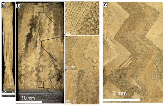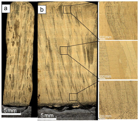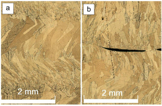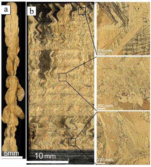 Along with the variable wall’s thickness, there is another problem related to using the low heat input in EBAM from the Cu-7.5wt.%Al wire. The layers composed of small grains were insufficiently remelted when depositing the next layer and, therefore, even some discontinuities were formed (Figure 4b).