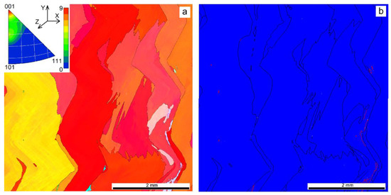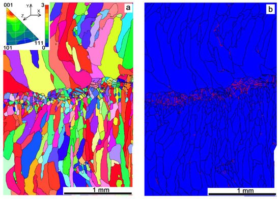 EBSD grain orientation distribution (a) and grain boundary types (b) in a cross section of the Cu-7.5wt.%Al wall obtained at heat input of 0.21 kJ/mm. Red lines in Figure 7b show the annealing twin boundaries.