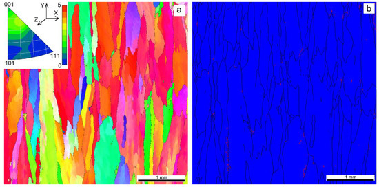 EBAM at heat input 0.255 kJ/mm demonstrated the absence of small grains and more perfect growth texture of the columnar zigzagged ones (Figure 8a). Even higher heat input 0.3 kJ/mm resulted in a reduced number of grains oriented in accordance to the cubic texture. In fact, no preferential orientation was observed in this case, with only small peak corresponding to orientations close to [117]-axis (Figure 9a). A columnar grain microstructure was formed that did not allow finding the fusion boundaries between the successively deposited layers.