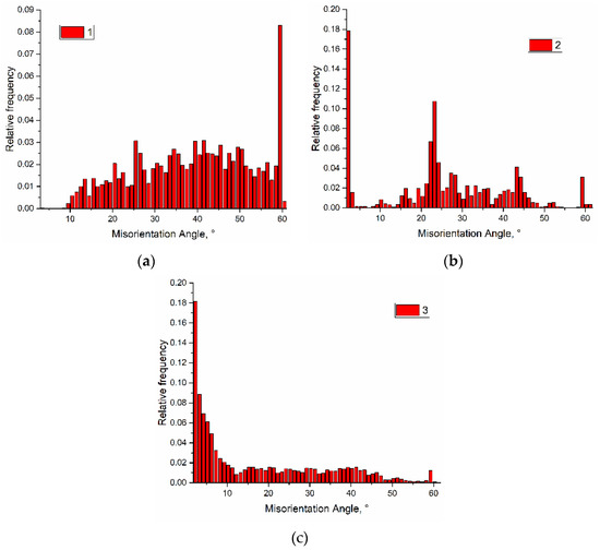 Misorientation angle distribution of grain boundaries for samples printed at 0.21 kJ/mm (a), 0.255 kJ/mm (b) and 0.3 kJ/mm high (c) heat input.