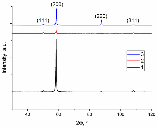 An XRD pattern for the Cu-7.5wt.%Al bronze samples printed at 0.21 kJ/mm (1), 0.255 kJ/mm (2) and 0.3 kJ/mm high (3) heat input.