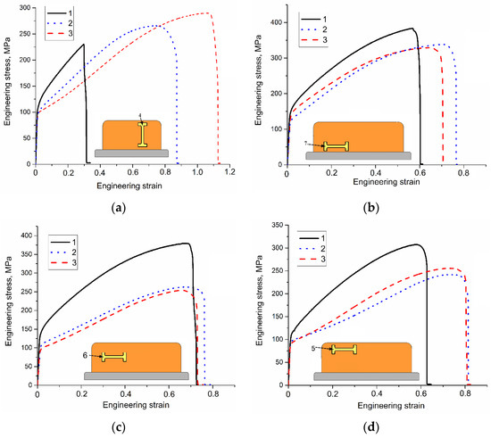 The “stress-strain” curves obtained from tensile tests on Cu-7.5wt.%Al samples 4 (a), 7 (b), 6 (c) and 5 (d). EBAM regime: 1—0.21 kJ/mm, 2—0.255 kJ/mm, 3—0.3 kJ/mm.