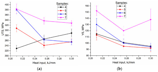 UTS (a) and YS (b) vs. heat input dependencies.