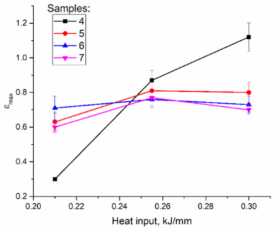 Strain-to-fracture dependencies of samples 5, 6, and 7 on the heat input show a tendency for improving plasticity of all samples at heat input 0.255 kJ/mm as compared to that of at 0.21 kJ/mm and then reducing it at 0.3 kJ/mm (Figure 14). The highest plasticity was achieved at 0.255 kJ/mm on sample 5 (cut off the top part of the wall).